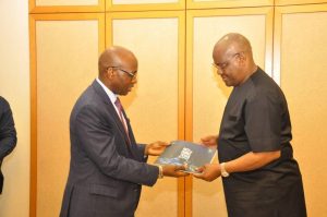Rivers State Governor, Nyesom Ezenwo Wike receiving a souvenir from the Managing Director of Nigerian Liquefied Natural Gas (NLNG) Limited, Tony Attah at the Government House Port Harcourt on Wednesday