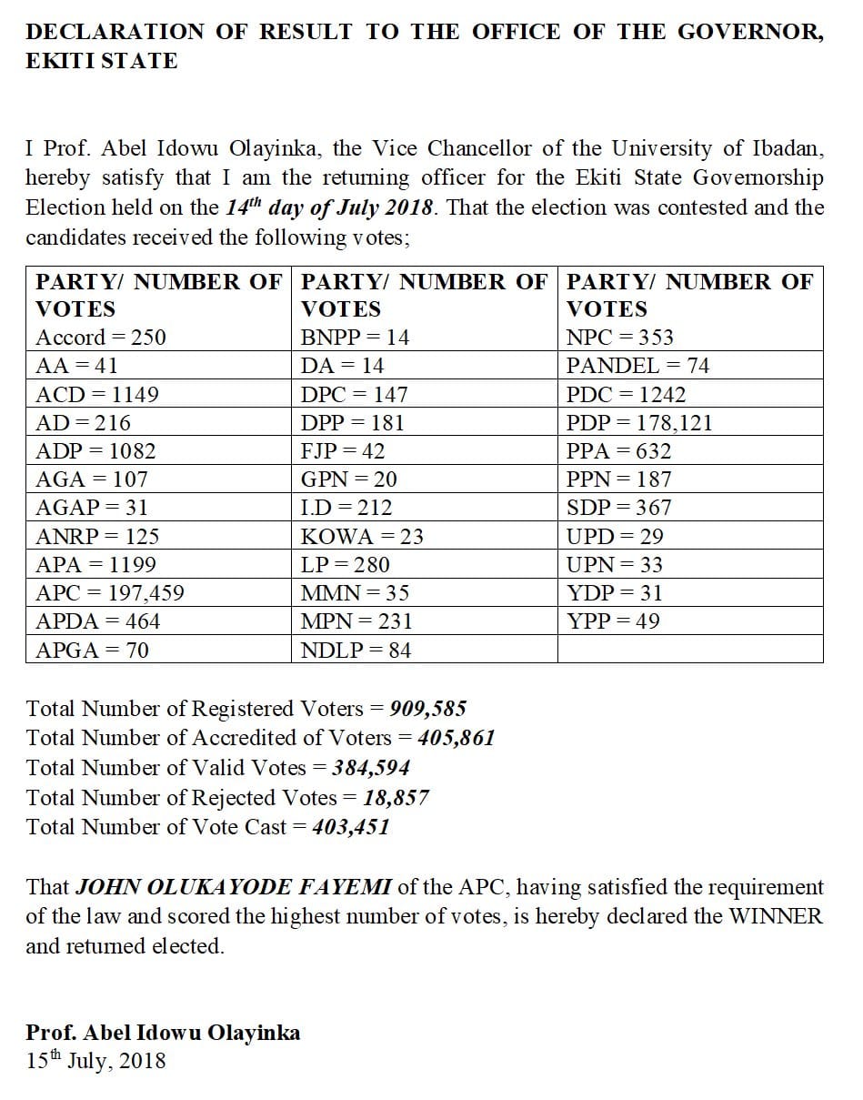 INEC Certified result of the Ekiti election