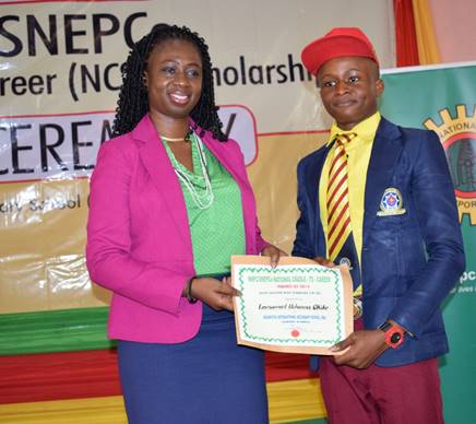 iSupervisor, Community Development, National Petroleum Investment Management Services (NAPIMS), Tolulope Derin-Adefuwa presenting Academic Excellence Award to Emmanuel Okike one of the 1st set of NNPC SNEPCo NC2C Beneficiary