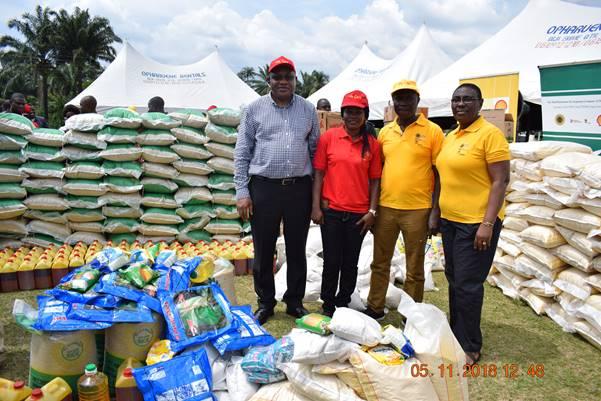 SPDC External Relations Manager Swamp West, Mr. Evans Krukrubo (left), leads SPDC team to distribute relief materials to flood victims in Ewheru IDP Camp...
