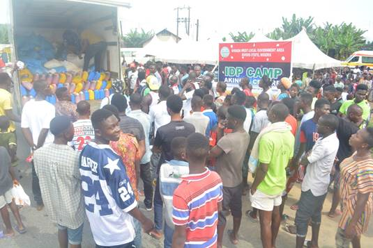 Volunteers at Akinima IDP Camp, Rivers State, lend hand to offload one of the trucks bearing relief materials for flood victims.