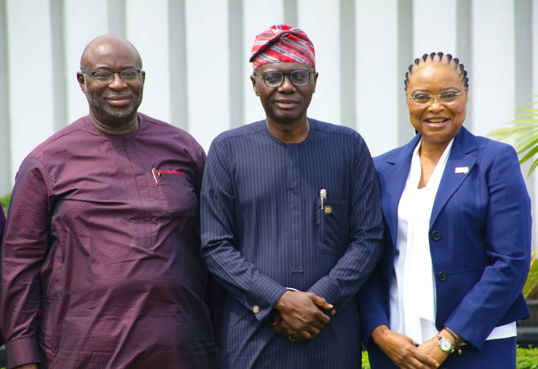Governor Babajide Sanwo-Olu of Lagos State (middle), LOC chairman, Barr. Seyi Akinwunmi (left) and Director of Organization, Aisha Falode (right).