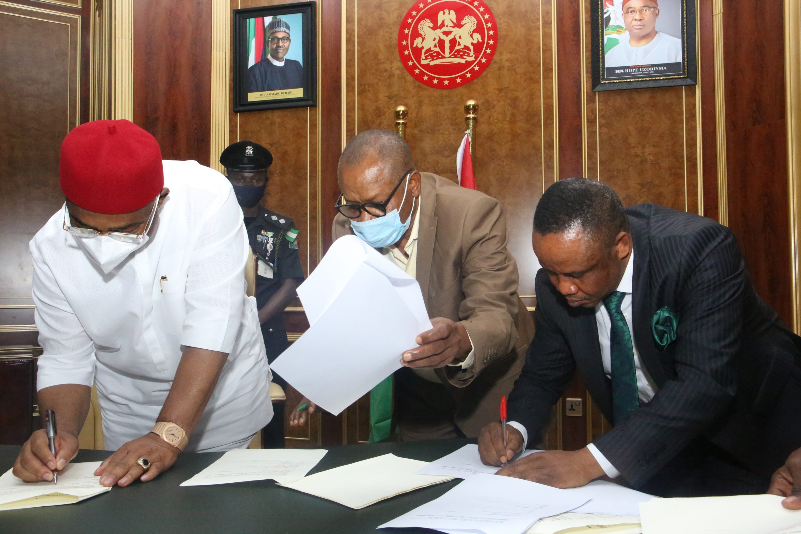 The Governor of Imo State, Senator Hope Uzodinma, (left) and the NDDC Interim Administrator, Dr. Efiong Akwa (right) sign an MOU for the completion...