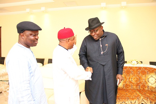 From Right: Governor Seriake Dickson of Bayelsa State, felicitates with his Abia State Counterpart, Chief Theodore Orji, while the host Governor, Dr. Emmanuel Oduaghan of Delta State, looks on with delight, at the South-South/South-East PDP Governors/Leaders Forum held in Asaba.