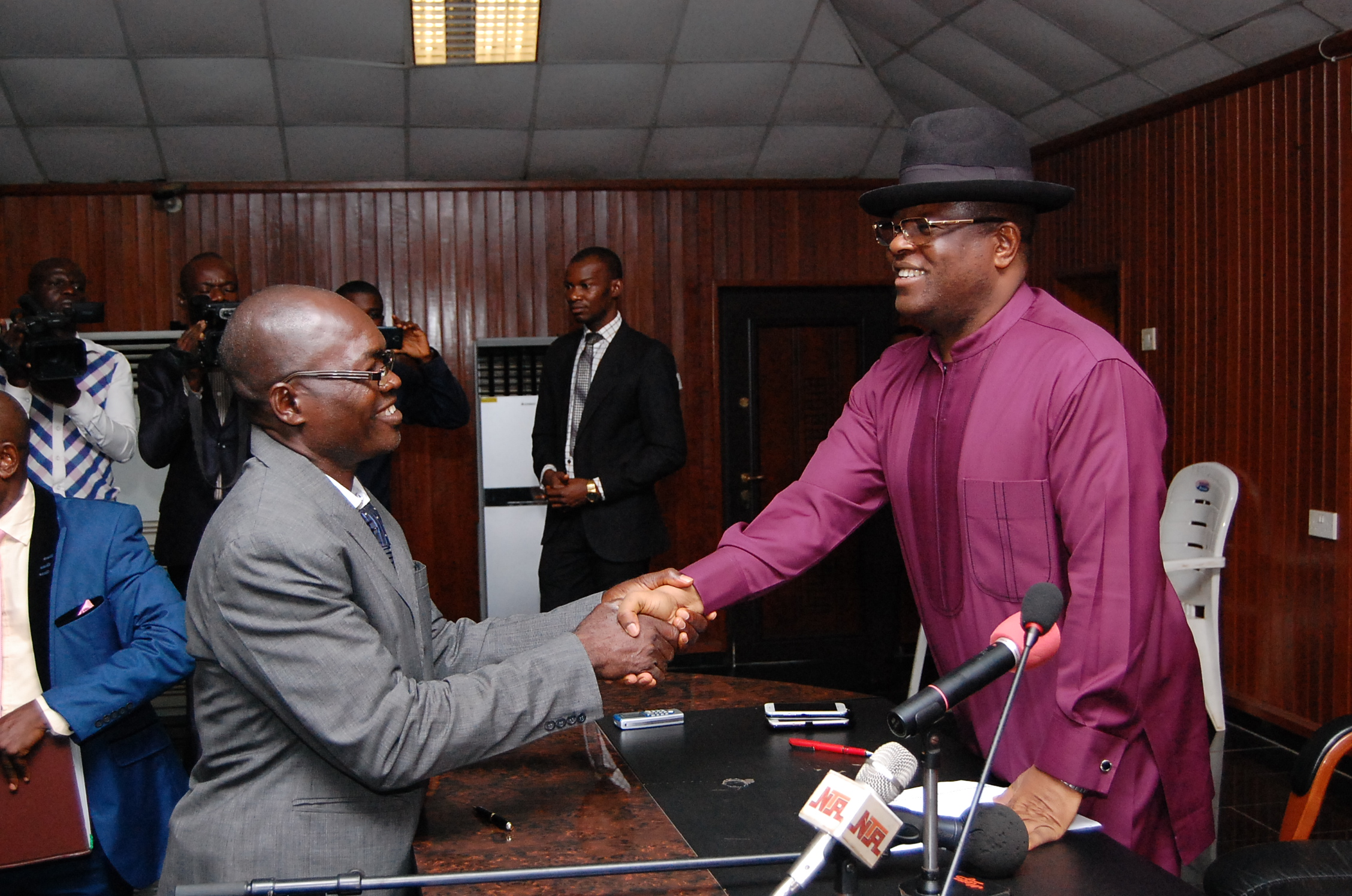 L-R: Chairman of Board, Ebonyi Broadcasting Corporation, Hon. Mrs. Patience Ogodo; Speaker, Ebonyi State House of Assembly, Rt. Hon. Francis Nwifuru, Governor Dave Umahi of Ebonyi State; Chief Judge of Ebonyi State, Justice Aloy Nwankwo; and Deputy Speaker, Ebonyi State House of Assembly, Rt. Hon. Odefa Obasi Odefa, during the swearing in ceremony of board members of Ebonyi Broadcasting Corporation on Friday in Abakaliki on Friday