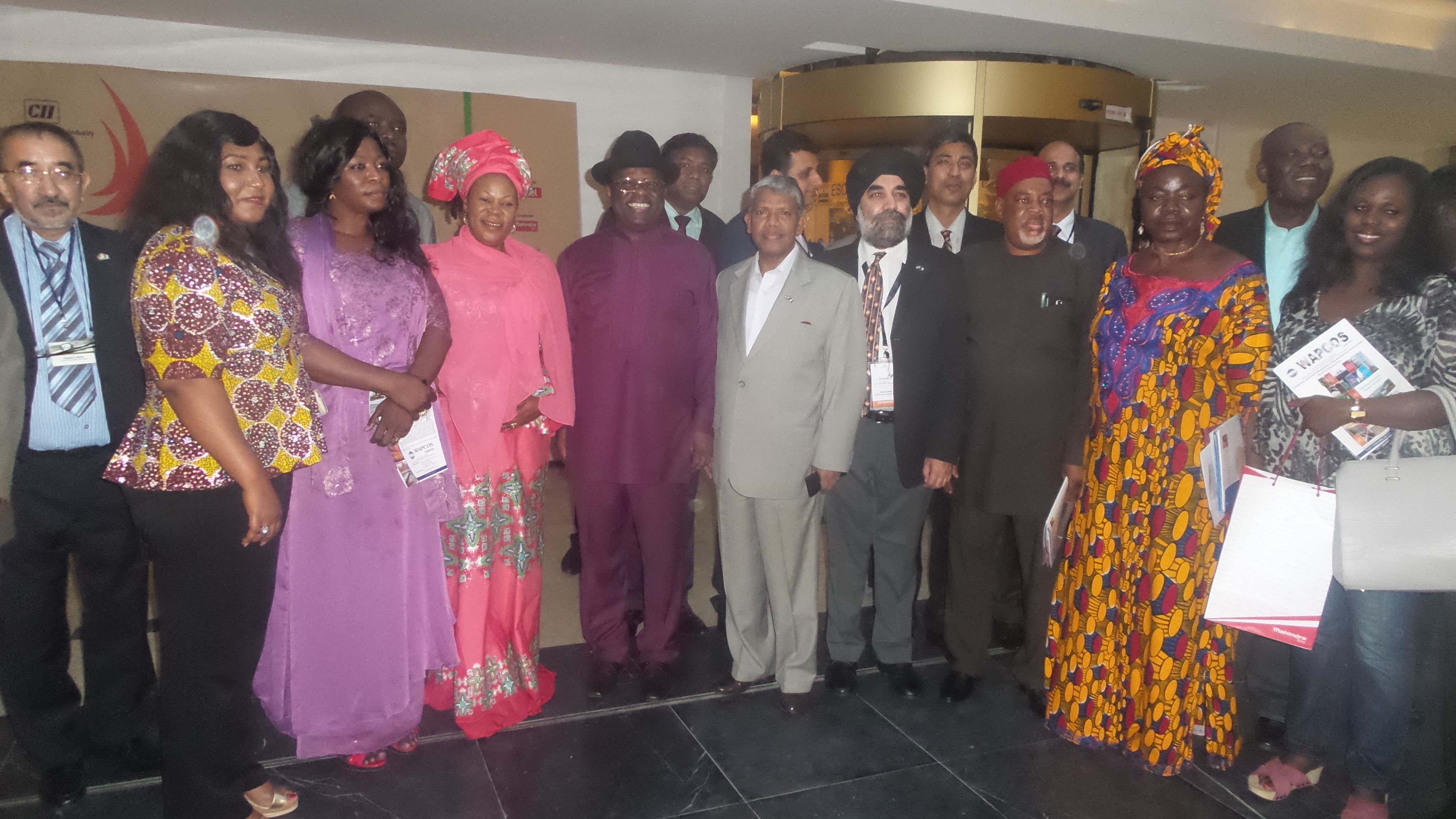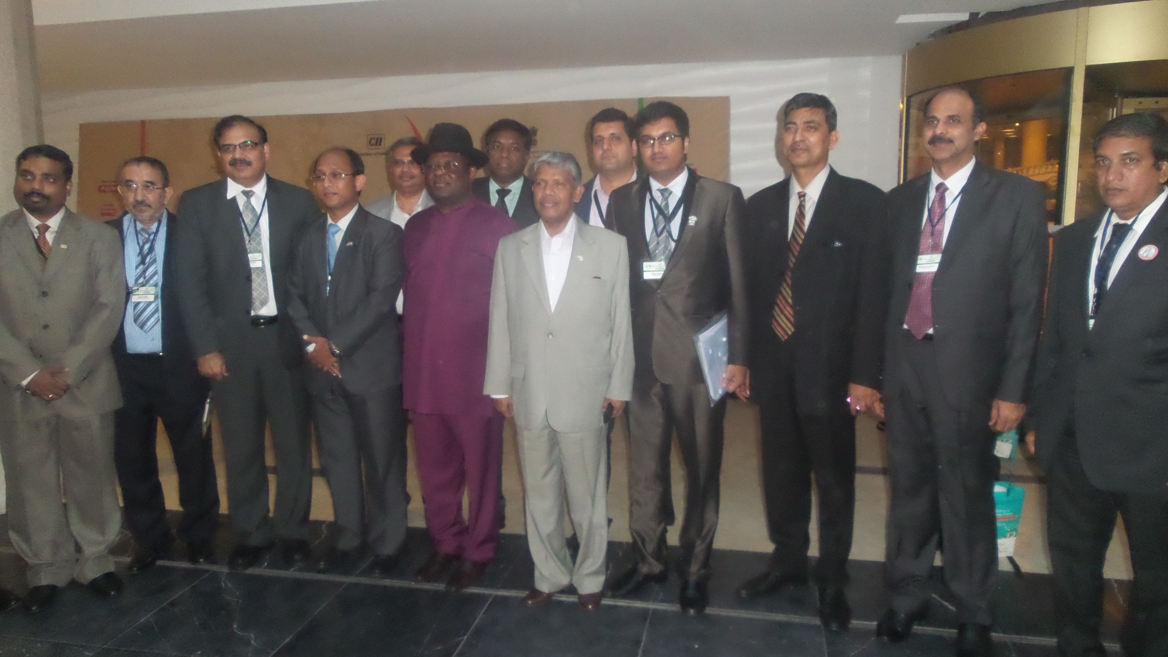 Ebonyi State Governor, Engr. Dave Umahi (wearing bowler hat); Indian High Commissioner to Nigeria, Ajjaunpur Ghanashyaun ( wearing Grey suit) in group photograph with Indian business executives in Lagos on Wednesday