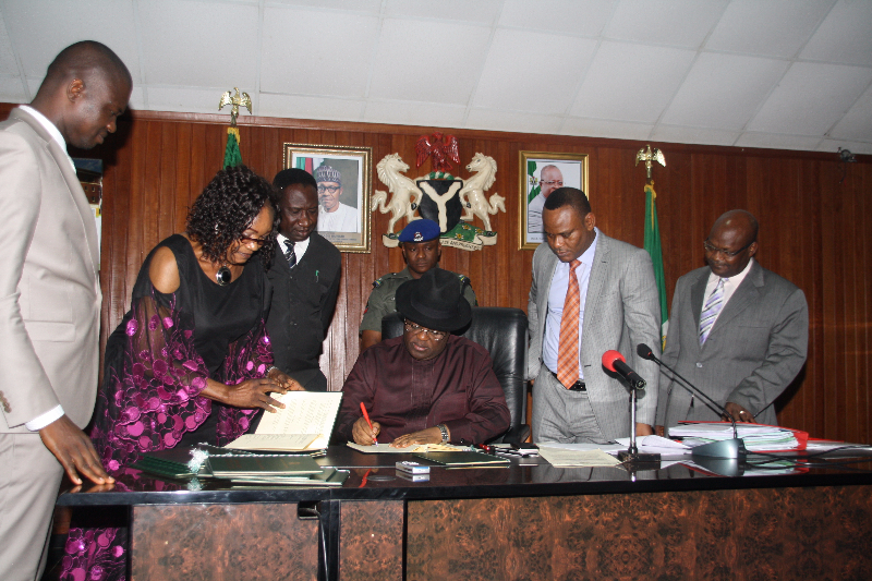 L-R: Speaker, Ebonyi State House of Assembly, Francis Nwifuru; Clerk of the State House of Assembly, Rose Nwokporo, Commissioner for Justice, Augustine Nwankwegu, Governor Dave Umahi of Ebonyi State; Deputy Governor, Kelechi Igwe; and Commissioner for finance, Dennis Ekumankama during the signing of three bills sent to the governor by the assembly in Abakaliki on Thursday.