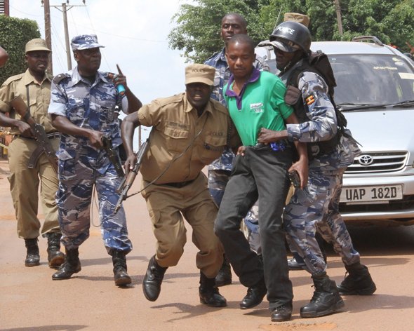 Associated Press/Rebecca Vassie – Ugandan police arrest a journalist outside the Daily Monitor offices Wednesday, May 29, 2013.