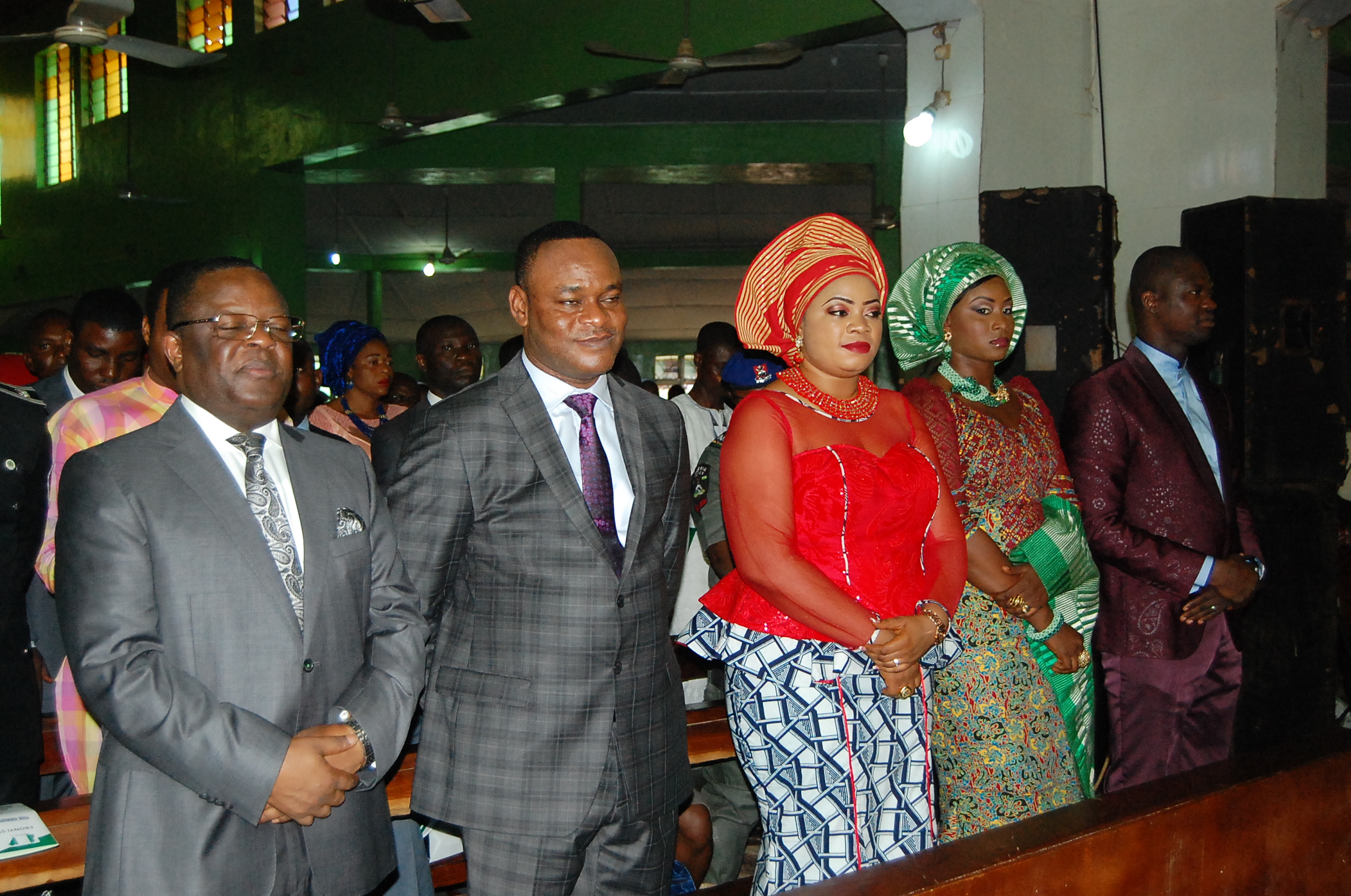 L-R: Governor David Umahi of Ebonyi State; Deputy Governor, Kelechi Igwe and wife of the Deputy Governor, Nnenna, at the Interdenominational Thanksgiving Church Service