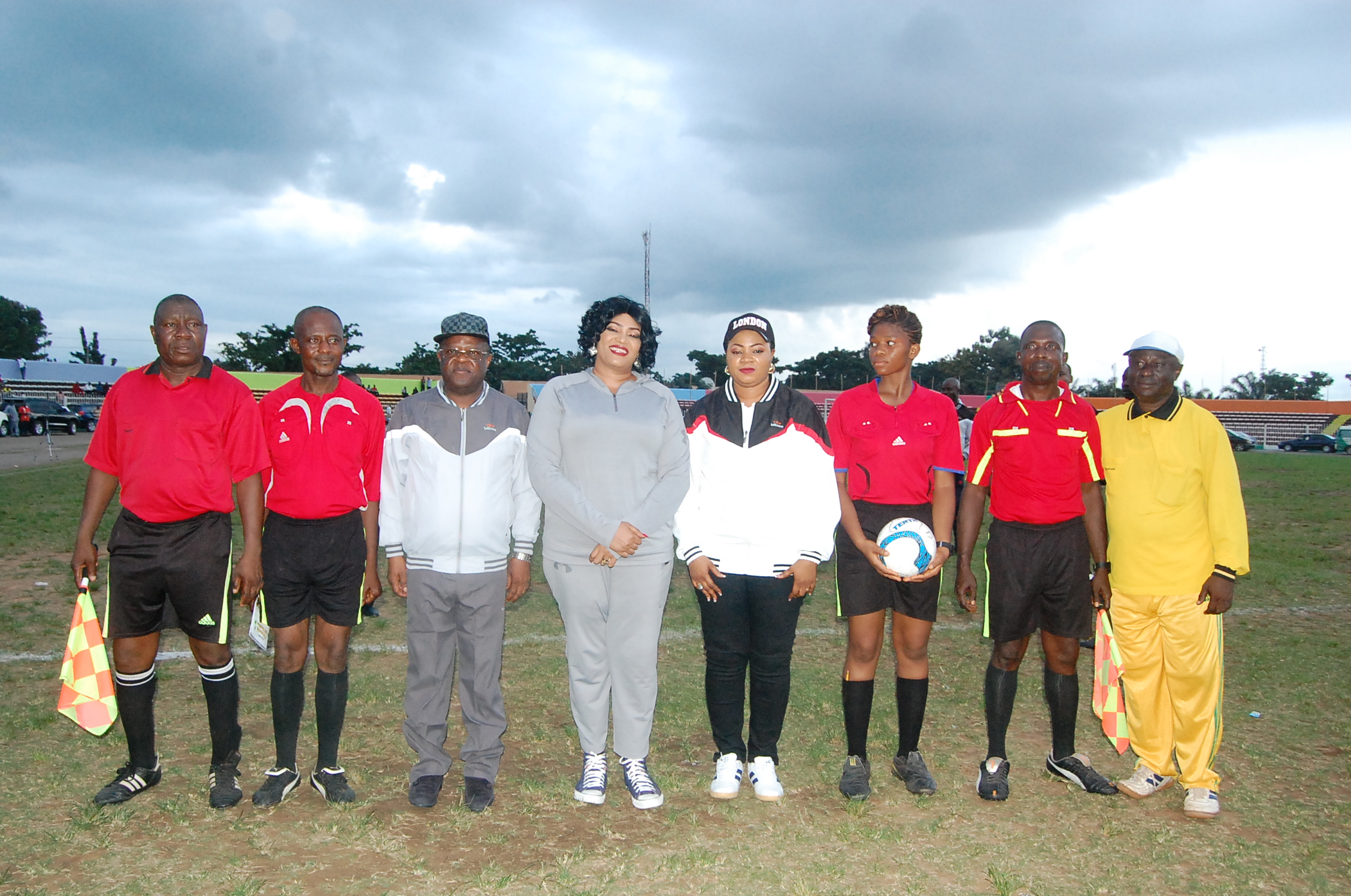Governor David Umahi of Ebonyi State(3rd left); his wife, Rachel; wife of the Deputy Governor, Nnenna and the match officials at a novelty football match organised by the government to mark the 19th anniversary of Ebonyi State and Nigeria’s 55th Independence at the Abakaliki Township Stadium, Abakaliki on Monday