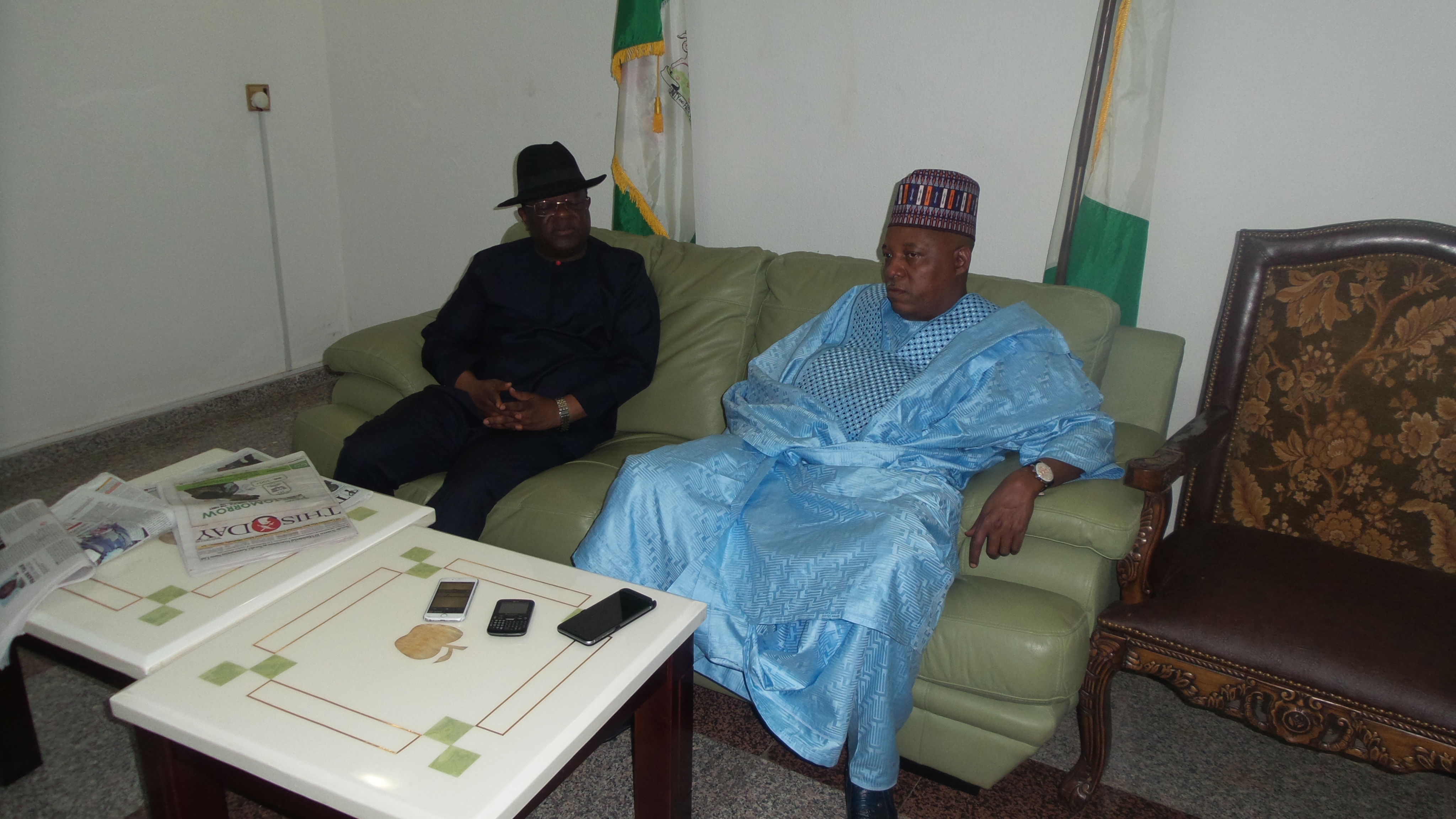 Governor of Ebonyi State, Eng David Umahi(left) and his Borno State counterpart, Alhaji Kasheem Shettima during the presentation of bags of Ebonyi rice and wrappers by Ebonyi State Government for Borno’s Internally Displaced Persons in Abuja on Wednesday.