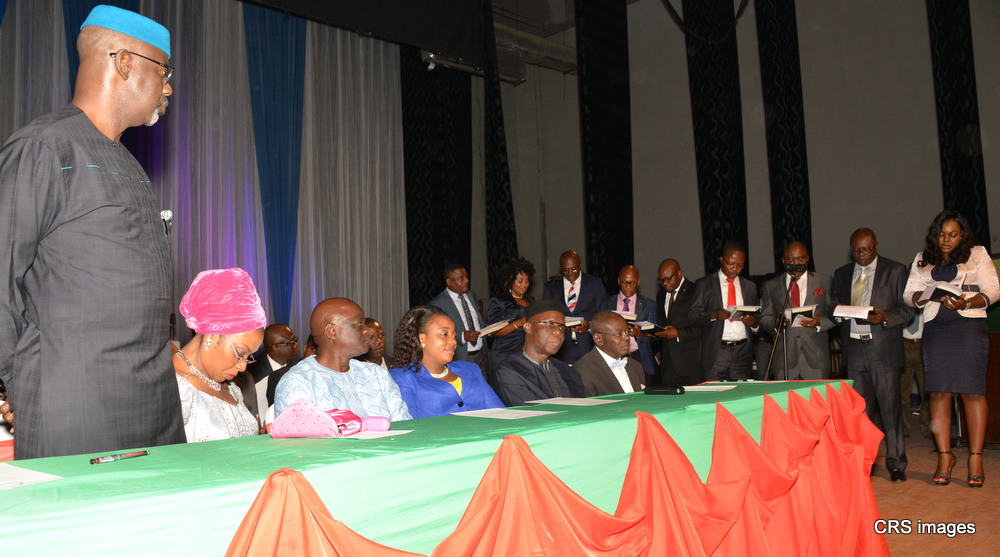 A cross Section of the newly sworn-in local government chairman in Cross River State taking the oath of office in Calabar, Monday.