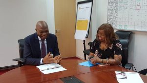 L-R: Managing Director, The Shell Petroleum Development Company of Nigeria Limited and Country Chair, Shell Companies in Nigeria, Osagie Okunbor and Kechi Okwuchi, survivor of the 2005 Sosoliso plane crash during a ‘Thank You’ visit to SPDC.