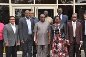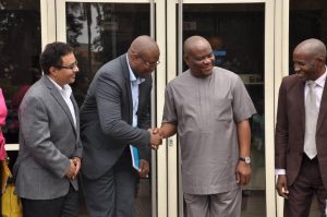 Rivers State Governor, Nyesom Ezenwo Wike (m) Deputy Governor Ipalibo Harry Banigo (2nd R), Leader of United Nations Delegation, Mr Charles Ekong (2nd L), BR Ravishankar (United Nations Environmental Programme, UNEP, Environmental Expert) (L) and Dr Luka Mangreep Ibrahim (World Health Organisation, Nigeria)(r) after a high-profile meeting to tackle the soot challenge at the Government House Port Harcourt on Wednesday.