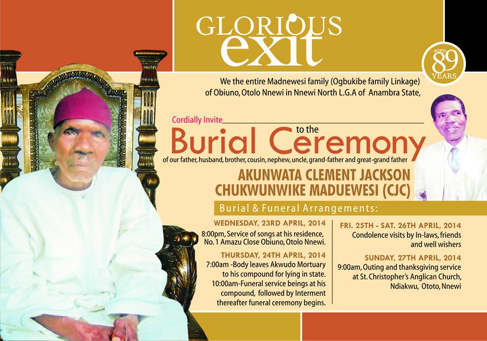 Akunwata shall be laid to rest at his compound, No. 1 Amazu Close, Obiuno Otolo Nnewi, near Igwe Orizu’s Palace, on Thursday 24th of April. In-laws, friends and well wishers shall pay condolences on Friday 25th of April, 2014.