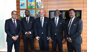 PHOTO 2: Infantino (middle) and Pinnick (second right) are joined by other African members of the Organizing Committee for FIFA Competitions: Arab Abigani (Somalia, right), Ahmed Yahya (Mauritania, left) and Suleman Waberi (Djibouti, second left)
