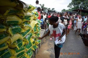 Volunteers at Akinima IDP Camp, Rivers State, lend hand to offload one of the trucks bearing relief materials for flood victims.
