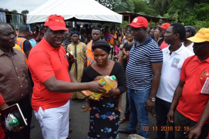 SPDC External Relations Manager Swamp West, Mr. Evans Krukrubo (left), leads SPDC team to distribute relief materials to flood victims in Ewheru IDP Camp in Delta State.