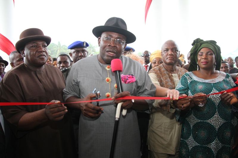 Bayelsa State Governor, Hon. Seriake Dickson (2ndleft) cutting the tape to commission the International Institute of Tourism and Hospitality at Elebele in Ogbia Local Government Area of the State, while the Minister of Tourism, Culture and National Orientation, Chief Edem Duke (left) Trinidad and Tobago High Commissioner to Nigeria, Nyahuma Obika (2ndright) and the Patron-World Fashion Organisation Africa, Mrs. Merit Gordon Obua (right) looks on.