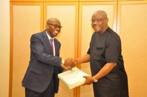 Rivers State Governor, Nyesom Ezenwo Wike receiving a souvenir from the Managing Director of Nigerian Liquefied Natural Gas (NLNG) Limited, Tony Attah at the Government House Port Harcourt on Wednesday