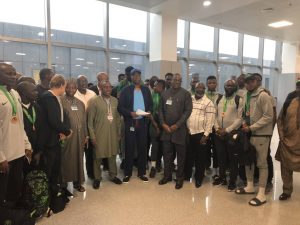 A chartered Air Peace aircraft that flew the delegation from Egypt landed in Abuja at about 10.40am, led by the NFF First Vice President, Barrister Seyi Akinwunmi, and also including the 2nd Vice President Shehu Dikko, General Secretary, Dr Mohammed Sanusi, Members of the Executive Committee, and players and officials of the Eagles.