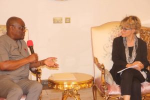 Rivers State Governor, Nyesom Ezenwo Wike (l) and the United Nations Special Rapporteur on Human Rights , Ms. Callamard Agnes during a meeting at the Government House Port Harcourt on Wednesday.