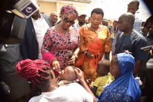 The NDDC Acting Managing Director, Gbene Dr Joi Nunieh, administers the cholera vaccine to a child at the Primary Healthcare Centre in the Ahoada West Local Government Area of Rivers State, Nigeria. On her left is the Vice Chairman of the council, Mrs Obele Jack Roberts.