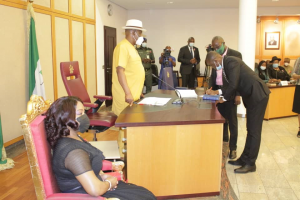 Rivers State Governor, Nyesom Ezenwo Wike watches as Justice Gbasam Okogbule of the Rivers State High Court signs a document after he was sworn in at the Government House Port Harcourt on Thursday, 24 December, 2020.