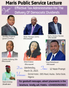According to the Secretary of Maris Trust Council, Fidelis Egugbo, “our eminent personality in focus, Esievo, the Executive Secretary of the Delta State Micro, Small and Medium Scale Enterprise Development Agency (DEMSA) shall join the Attorney-General and Commissioner for Justice, Delta State, Peter Mrakpor (SAN), Mr Emeka Anthony Odo, Executive Chairman, Enugu State Internal Revenue Service, Dr. Shefiu Abiodun Muritala, Accountant-General of Lagos State; and the Chairman, House Committee on Public Accounts, Delta State House of Assembly, Hon. Tony Elekeokwuri to discuss the topic, ‘Effective Tax Administration For The Delivery Of Democratic Dividends’ at this year’s edition of Maris Public Service Lecture.”