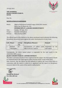The statement alleged that the management of Jigawa Golden Stars had featured one Christopher Richard in the NPFL fixture in spite of being informed by the LMC prior to the encounter that he was not eligible to play having accumulated five yellow cards.