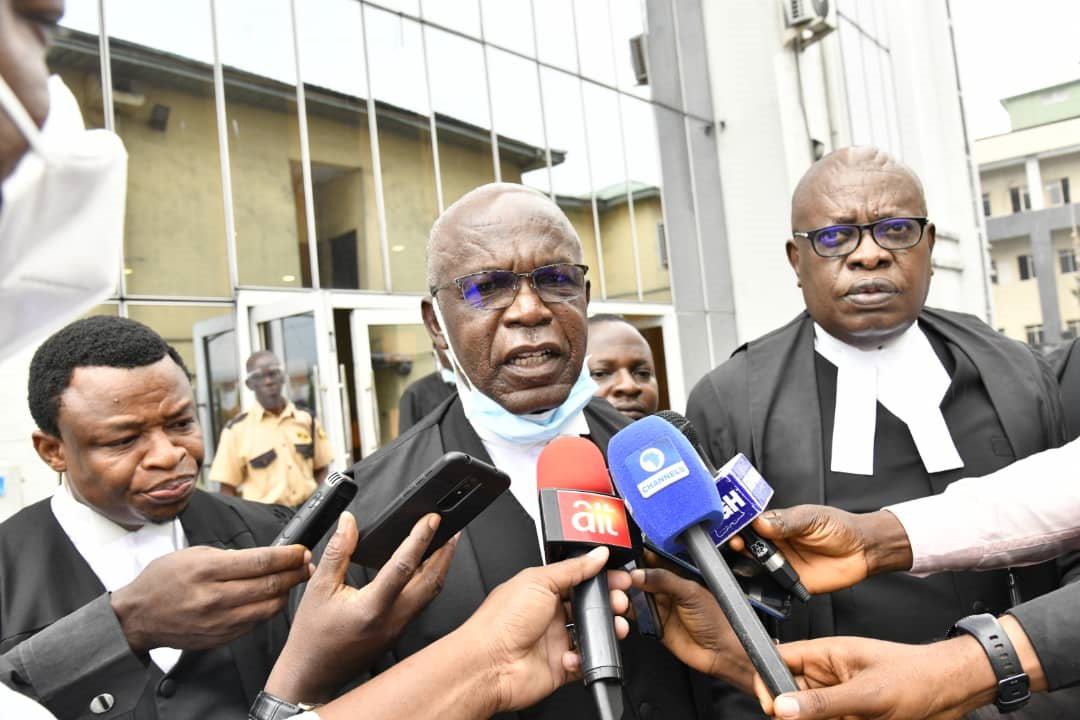 Donald Chika Denwigwe, SAN (middle) lead counsel to Government of Rivers State and Ken C.O. Njemanze, SAN (left) briefing journalists after the Federal High Court in Port Harcourt on Monday declared FIRS collection of Value Added Tax in Rivers State unconstitutional.