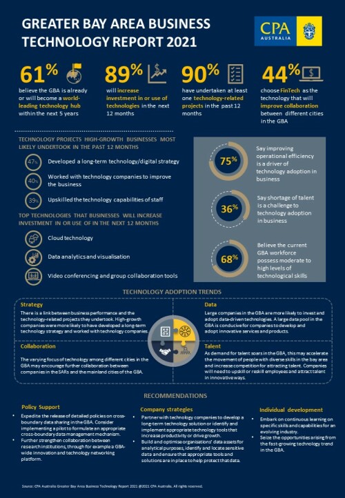 “Talent supply and data assets are conducive to creating a sustainable ecosystem to nurture more technology companies in the GBA and to support the digital strategies of non-tech businesses. We suggest that GBA governments consider introducing more resources and policies to attract and retain tech-savvy talent or to upskill or reskill the current workforce with the relevant technology skills.