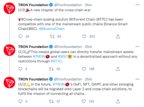 SINGAPORE – Media OutReach – 5 November 2021 – On November 4, TRON made an announcement on Twitter, cross-chain scaling solution BitTorrent Chain (BTTC) has been compatible with one of the mainstream public chains Binance Smart Chain (BSC), which means global users can directly transfer mainstream assets between TRON and BSC in a decentralized approach without any restrictions through BTTC.