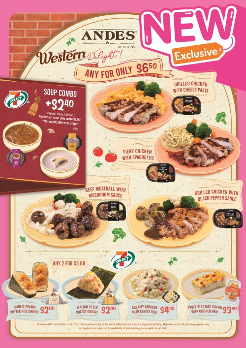 7-Eleven is exclusively launching an all-new selection of four tempting ready-to-eat meals from Andes by Astons on 10 Nov. Enjoy restaurant-quality western dishes at home or the office in a matter of minutes. Then complete your meal with new hearty additions to the 7-SELECT menu including savoury light bites and comforting soups!