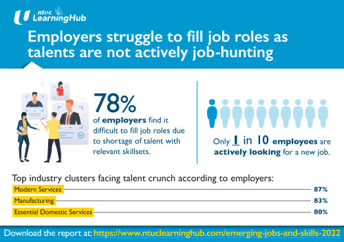 The report reveals that industry clusters facing a greater talent crunch are Modern Services (87%), Manufacturing (83%) and Essential Domestic Services (80%). These include roles in Infocomm Technology (ICT) and Media, Energy and Chemicals, and Healthcare respectively.