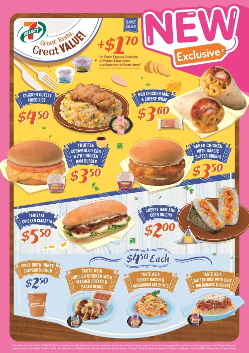 Enjoy $0.50 off Fresh Express Coleslaw or Potato Salad when you buy 7-SELECT Chicken Cutlet Fried Rice, BBQ Chicken Mac and Cheese Wrap, Truffle Scrambled Egg with Chicken Ham Burger or Baked Chicken with Garlic Butter Burger from 16 Feb – 1 Mar 2022!