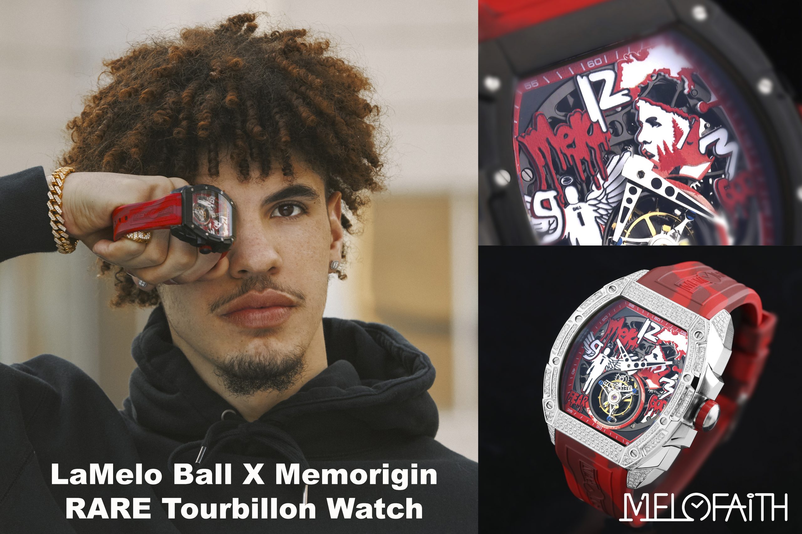 Melofaith introduces its first high-end fashion item – the “RARE Tourbillon”, designed in complete LaMelo Ball style. Using a strong fiery red as the primary color, the watch features a unique tonneau-shaped case and a stylish red camouflage rubber strap, breaking the tourbillon’s traditional notion of polished, genteel elegance.