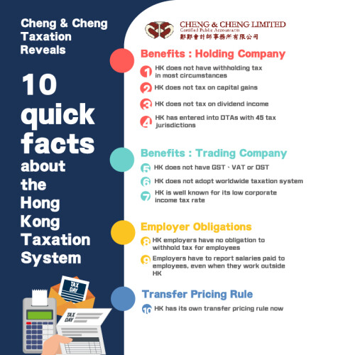 Cheng & Cheng Limited, one of the member firms of Cheng & Cheng Group, is an accounting firm established in Hong Kong with over 250 staff located in Hong Kong and Mainland China. We are the principal auditor for 10 listed corporations in Hong Kong and the tax advisor for over 80. We specialise in providing Hong Kong, Mainland China and international tax advisory services, as well as transfer pricing services to international clients. If you would like to know more about Hong Kong’s taxation system, or seek specific tax advice from our tax experts, please do not hesitate to contact us by email (henry.kwong@chengtax.com.hk) or phone (3962 0114).
