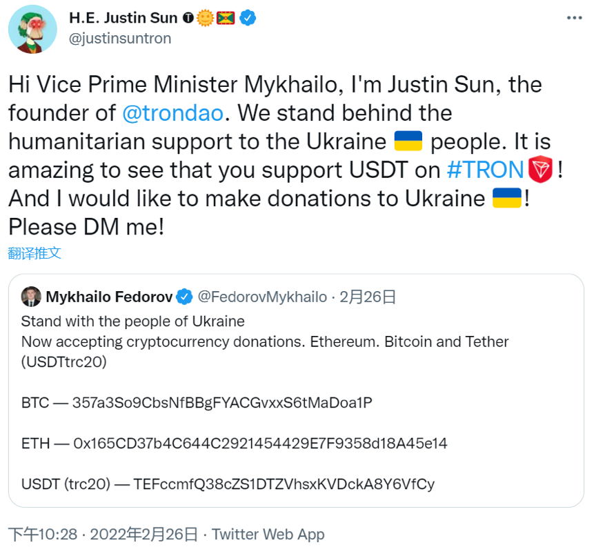 On February 26, Vice Prime Minister of Ukraine Mykhailo Fedorov announced the acceptance of cryptocurrency donations and revealed USDT donation addresses of Ethereum, Bitcoin, and TRC20-USDT. Shortly after, founder of TRON Justin Sun (now appointed Ambassador and Permanent Representative of Grenada to the WTO) called on the crypto community to join in the humanitarian aid initiative, following which he made a donation of $200,000 in TRC20-USDT.