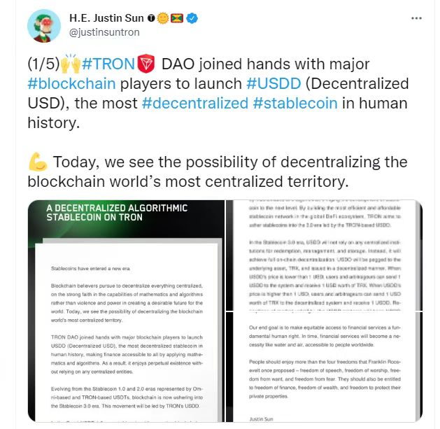 TRON DAO will partner with other blockchain industry leaders to establish USDD. It will leverage the power of mathematics and algorithms to achieve the overarching goal of financial freedom for all. In another open letter, Sun mentioned that a TRON DAO Reserve would be established to ensure the sustainable development of USDD.