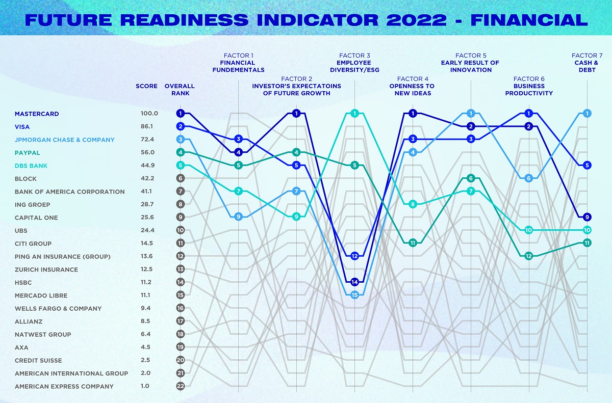 The Future Readiness Indicator examines the top 23 retail banks, insurance companies, and payment platforms based on $7.1 billion to $183.4 billion revenue and ranks against data from 2015 to March 2022. The indicator measures against the following criteria: financial fundamentals, investors’ expectation of future growth, employee diversity/ESG, cash and debt, business productivity, early results of innovation, and openness to new ideas.