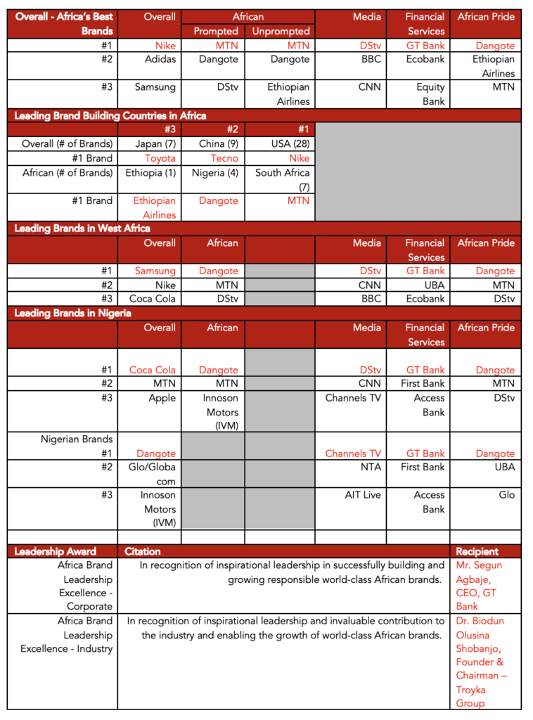 MTN, the perennially leading African brand has returned to the Top 10 as the highest ranking African brand and switched places with Dangote as the #1 African brand recalled when prompted to consolidate its status as the #1 African brand.