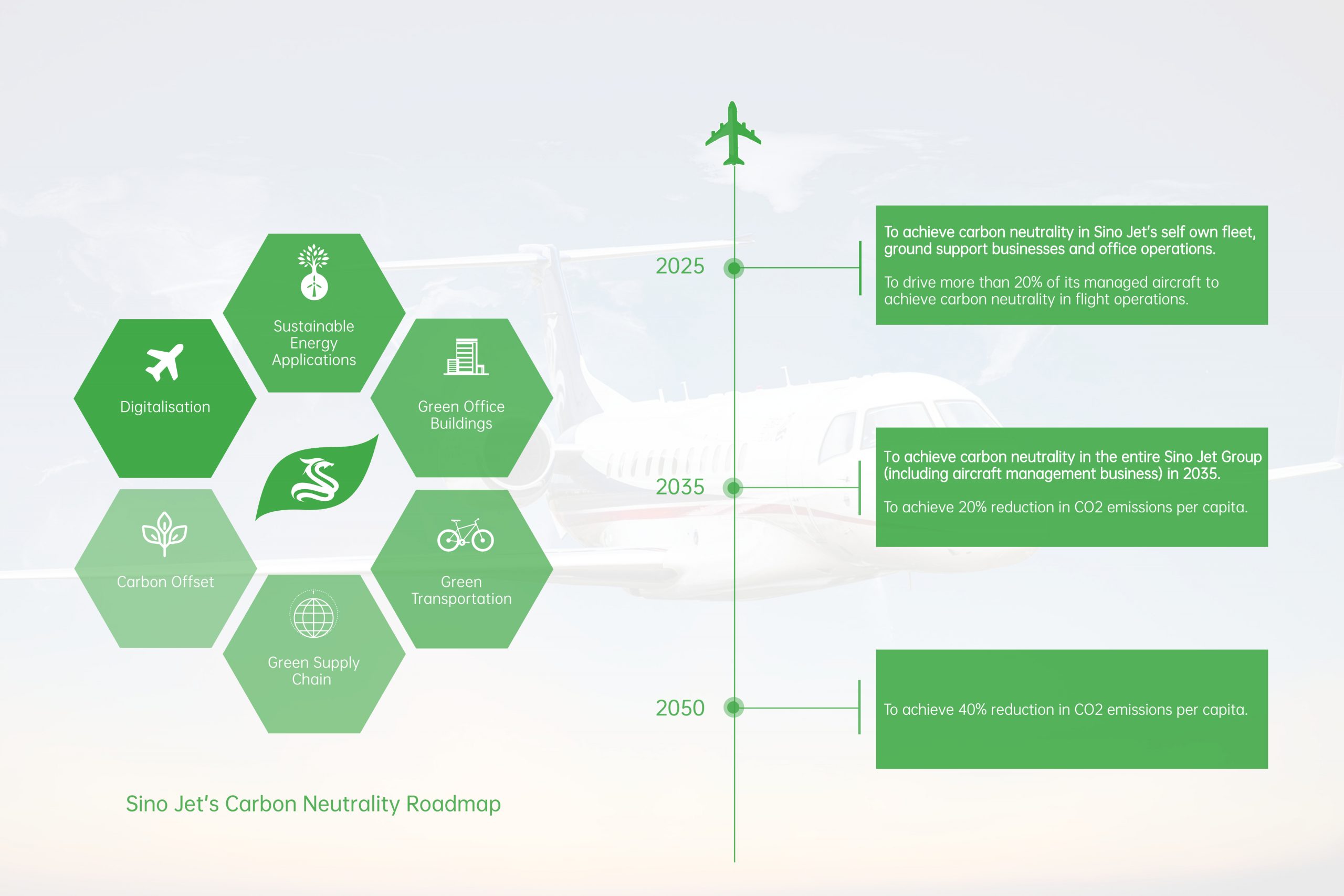 To expediate the accomplishment of carbon neutrality, Sino Jet’s primary goal is to achieve neutrality in operating its self-own aircraft. Sino Jet has already begun with the development of a carbon management system that is suitable for business jet operations, fully integrable with its information management system, to create a quantifiable, traceable green aircraft operation and to achieve neutrality its self-own fleet operations, ground services, and office operations in 2025. In terms of carbon emission per capita within the company, Sino Jet targets a 20% reduction in 2035 and a 40% reduction in 2050.