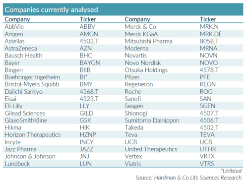 Historically, data from over 100 companies has been accumulated, but industry consolidation means that just 40 are included currently, which command an estimated 76% of the global drug industry. The main exceptions are the Chinese companies where insufficient data are available on a consistent basis.