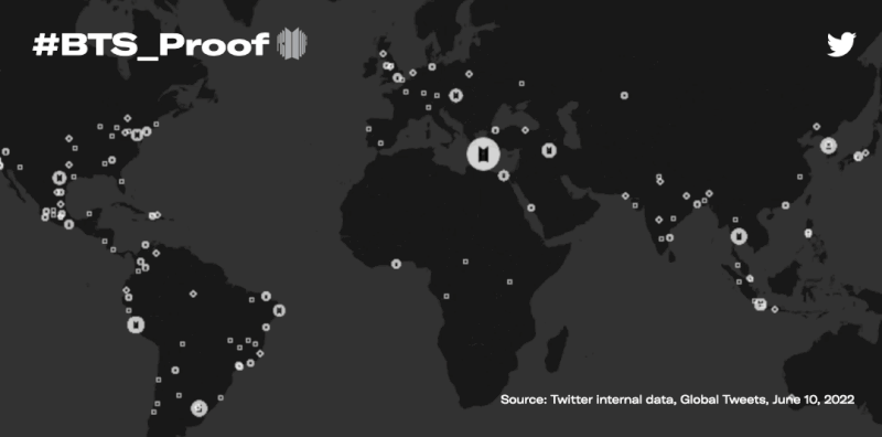 Twitter launched custom emojis for fans to join in the festivities regardless of where they were. A grey-colored BTS symbol could be included by using hashtags #BTS and #방탄소년단, while #BTS_Proof would activate a special Proof emoji. Furthermore, #YetToCome and #TheMostBeautifulMoment would activate emojis too. Additionally, @TwitterMusic also changed its header to a BTS concept image, bio to #BTS_Proof and name to ‘Twitter Music is listening to BTS “Proof“‘ to promote the new album.