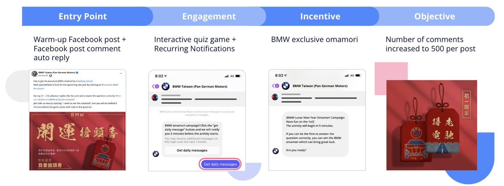 “With the directions pre-discussed with BMW Taiwan, we designed the social campaign for the Lunar New Year holiday, hoping to increase the number of engagements that BMW Taiwan could have for Facebook campaigns. With BotBonnie’s expertise in conversational marketing, we not only hit the target but also greatly exceeded expectations in several key results,” said Brian Chen, Account Manager at Bremen Digital Creative.