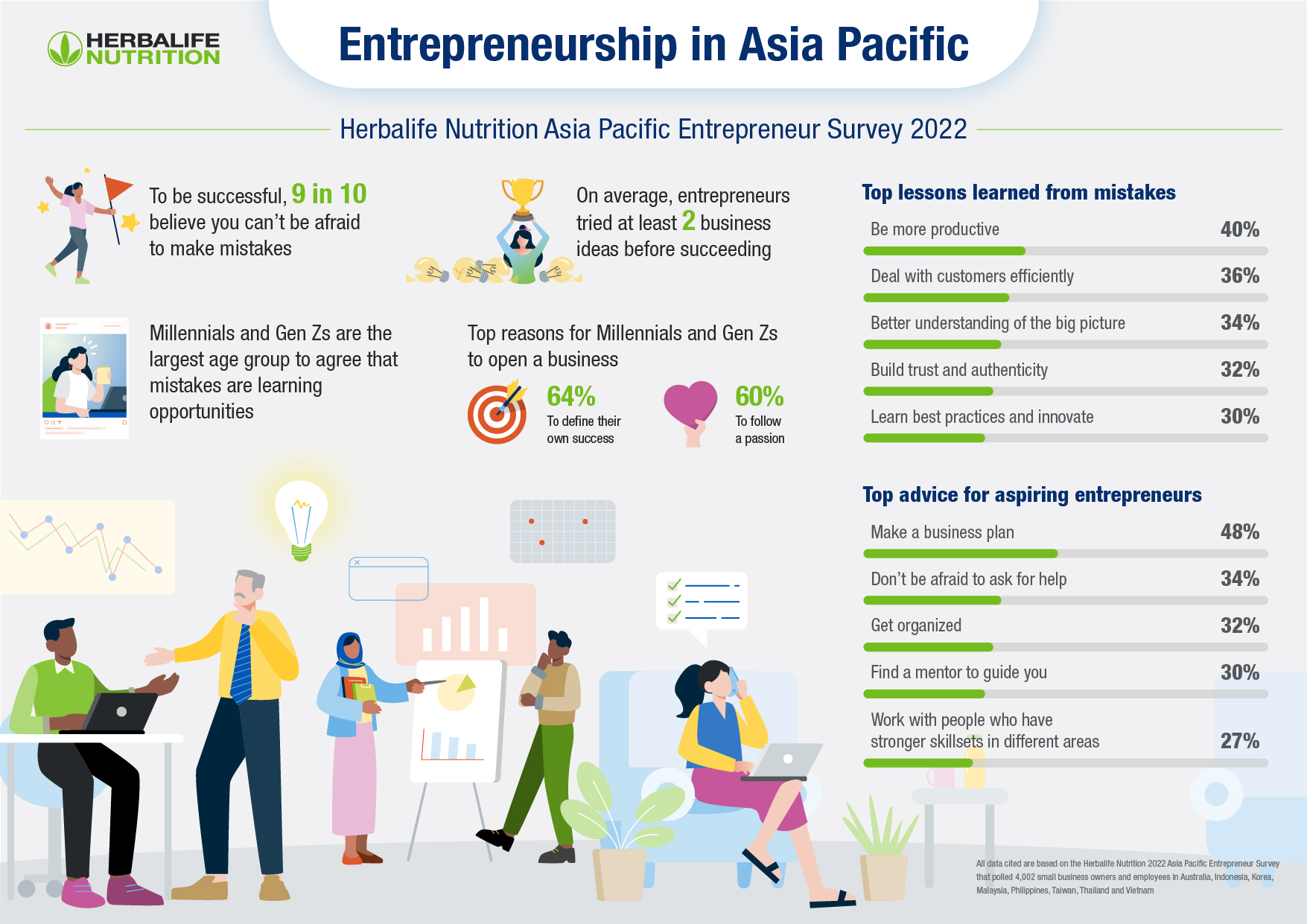 Herbalife Nutrition’s fourth annual survey aimed to examine entrepreneurship trends and attitudes towards resiliency among 4,002 small business owners and employees. It was conducted by One Poll in Australia, Indonesia, Korea, Malaysia, Philippines, Taiwan, Thailand, and Vietnam, with respondents ranging from Generation Z to the Boomer generation.