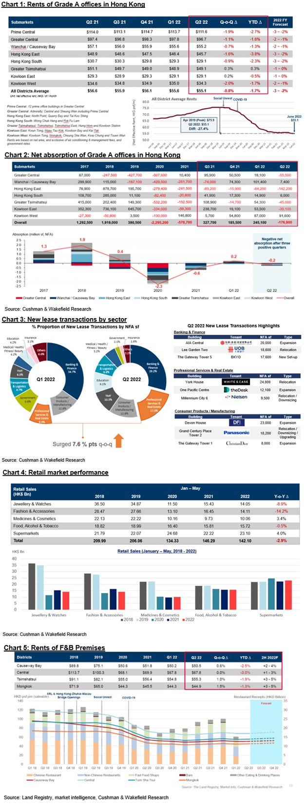 - Rent for F&B outlets is expected to rise by 1% to 5% in 2H 2022, offsetting the decline from January to June. Overall F&B rental level for 2022 is expected to remain stable.