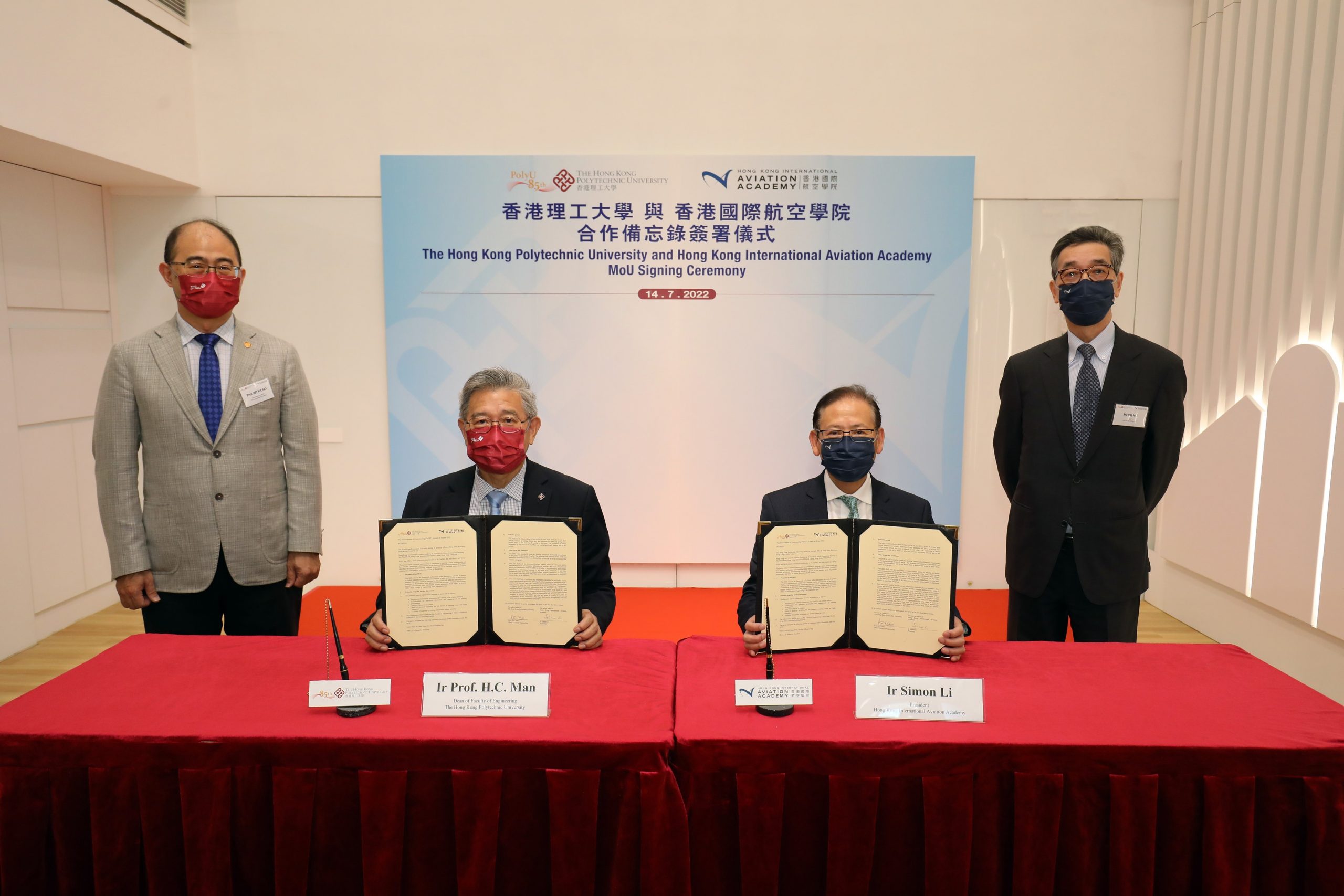 Witnessed by Prof. Wing Tak WONG, Deputy President and Provost of PolyU, and Mr CK NG, CEO of HKIA Services Holdings Ltd., the MoU was signed by Ir Prof. H.C. MAN, Dean of Faculty of Engineering, PolyU, and Ir Simon LI, President of HKIAA, at the signing ceremony held on PolyU campus.
