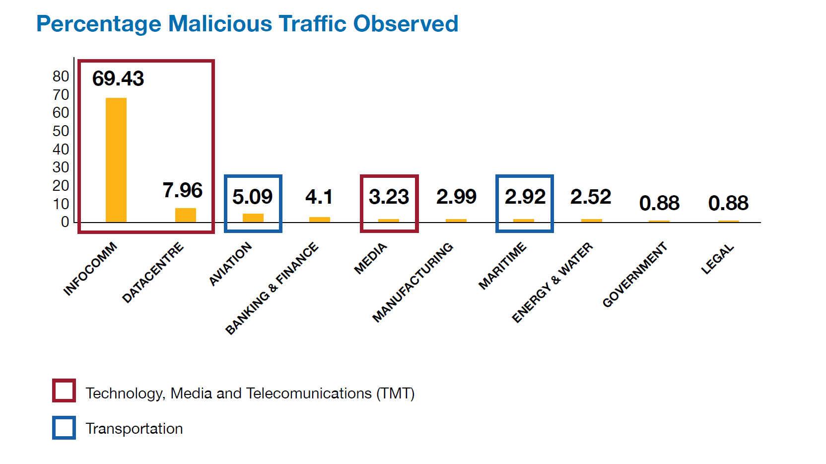 The Technology, Media, and Telecommunications (TMT) industry group, comprising infocommunications[1], data centre and media sectors, was the top target for threat actors in 2021. Ensign found that nearly 70% of malicious traffic observed in Singapore in 2021 was directed at the infocommunications sector.